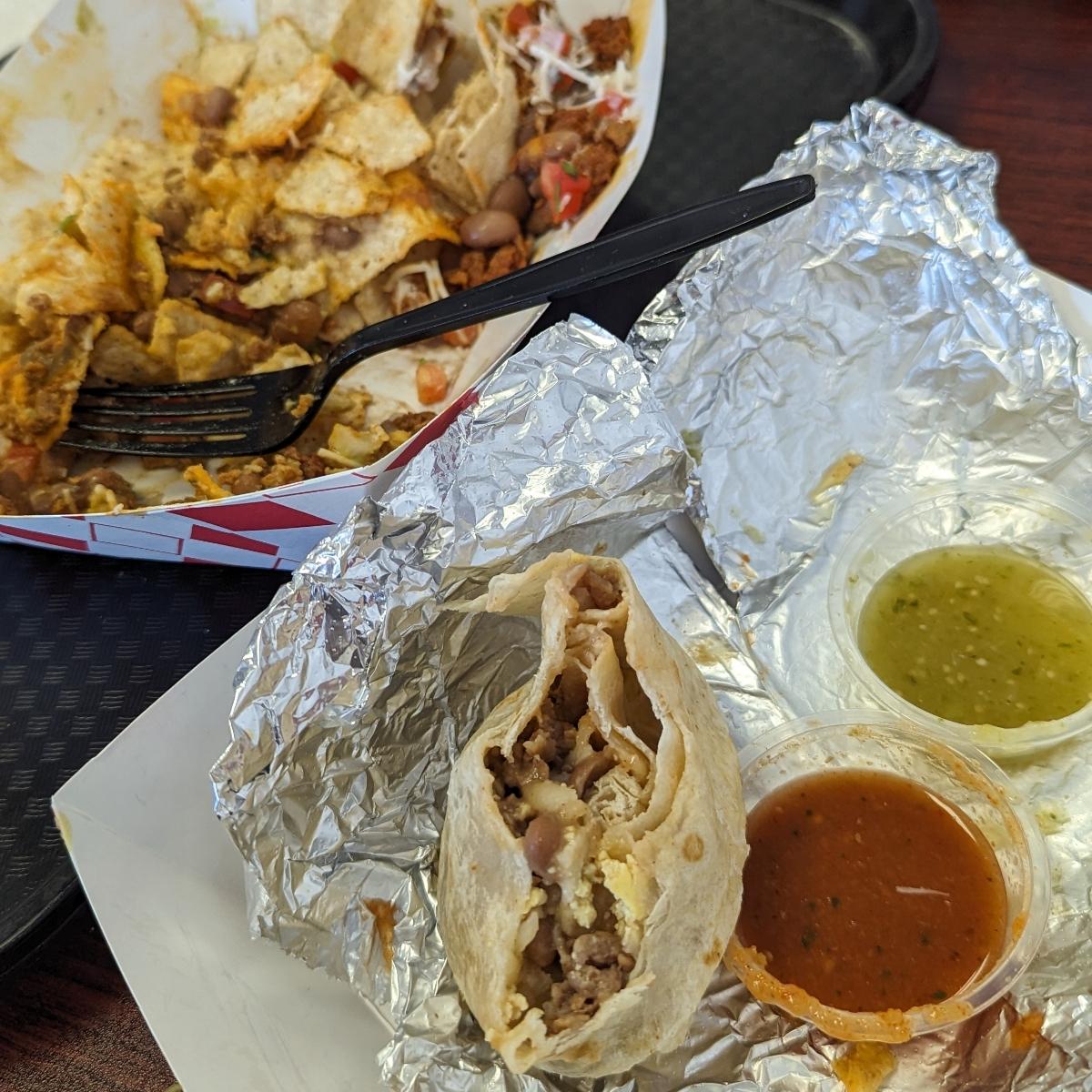 Strip mall vegan burrito and pizza place! Really saved us, as we were stuck for a few hours at a body shop after our car door fell off (long day, long story). After just searching "vegan" around us we were shocked to see this restaurant a few minutes walk down the road. Starving, the breakfast burritos were filling and delicious and the nachos topped it off. Ate most of it before remembering to get a picture.