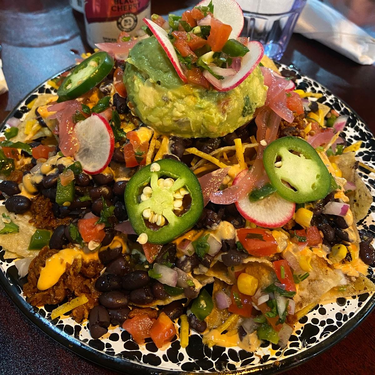 Incredible vegan nachos stacked with vegan chorizo, cheese, beans, and other yummy toppings.