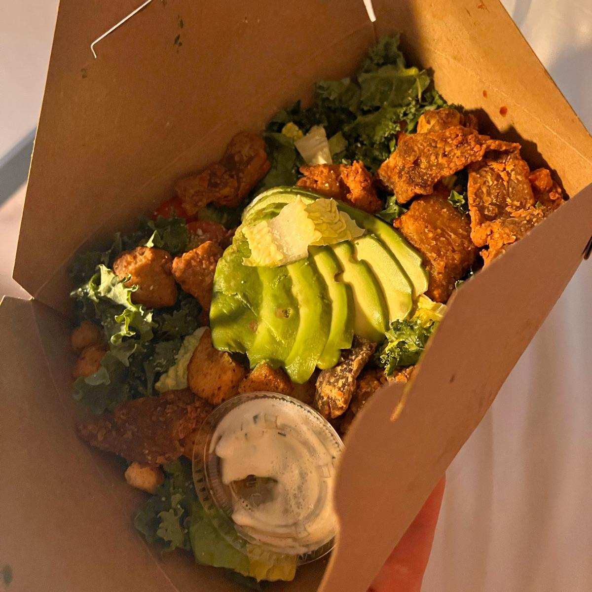 #kale , #garlic croutons, fried #seitan , #avocado , and a fabulous #ranchdressing .