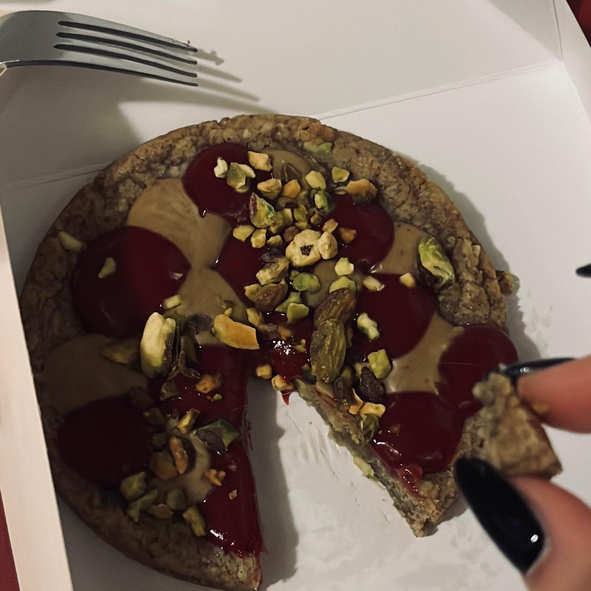 Realmente me encantó. Es una cookie de pistachos, con crema de pistachos; jelly de frambuesa, y pistachos tostados como topping.