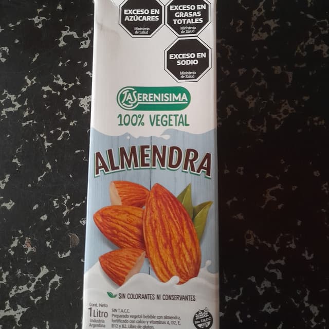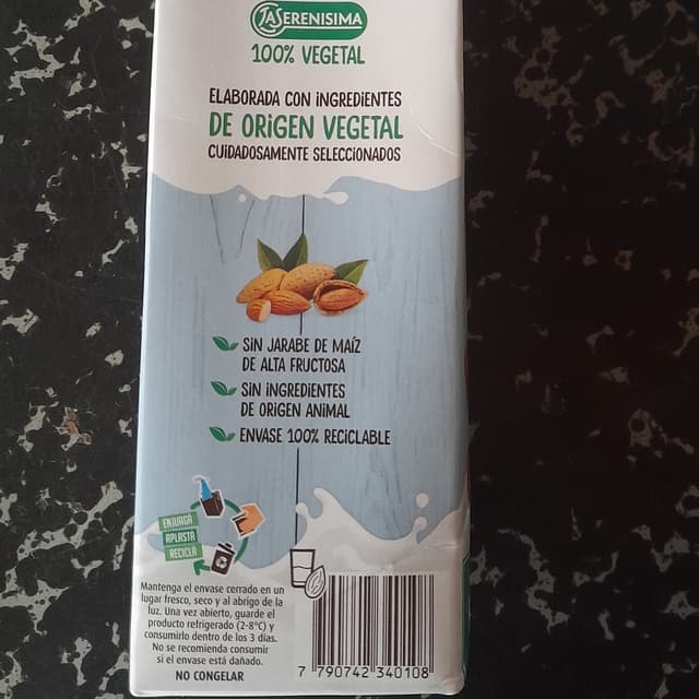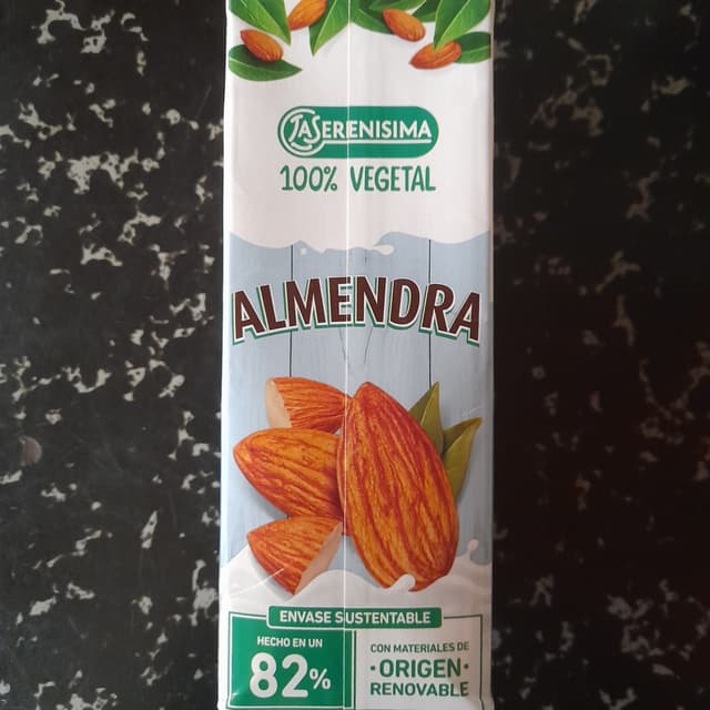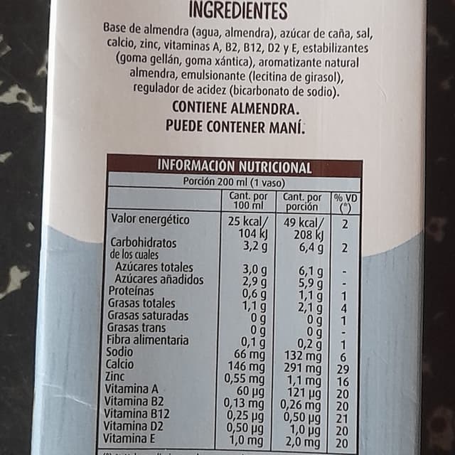 Base d almendra (agua, almendra), azúcar d caña, sal, calcio, zinc, vitaminas A, B2, B12, D2 y E, estabilizantes (goma gellán, goma xántica), aromatizante natural almendra, emulsionante (lecitina d girasol), regulador d acidez (bicarbonato d sodio).