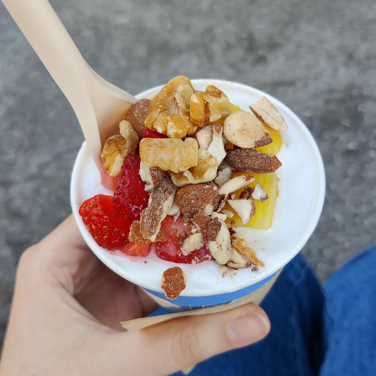 Buono, ci sono diverse scelte di topping, ma solo frutta e frutta secca sono vegani. Un po' caro (5€ per il formato piccolo).