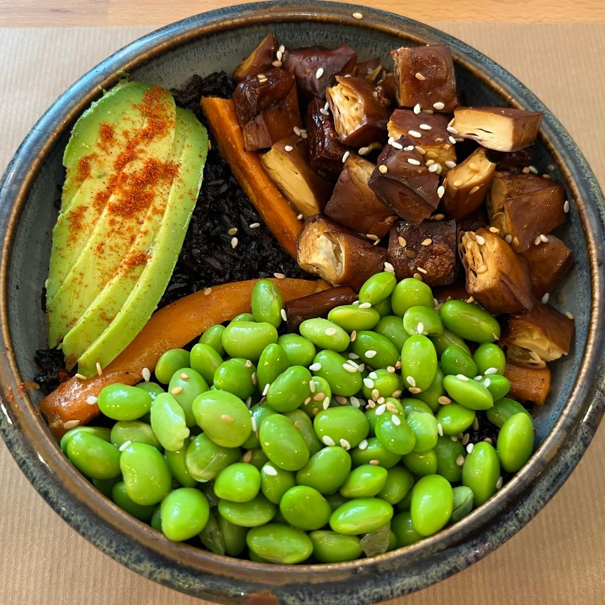 L’association d’edamame, de tofu au 5 parfums, d’avocat et de riz noir, le tout assaisonné d’une sauce soja-sésame en fait un plat original, et très goûteux. Je recommande