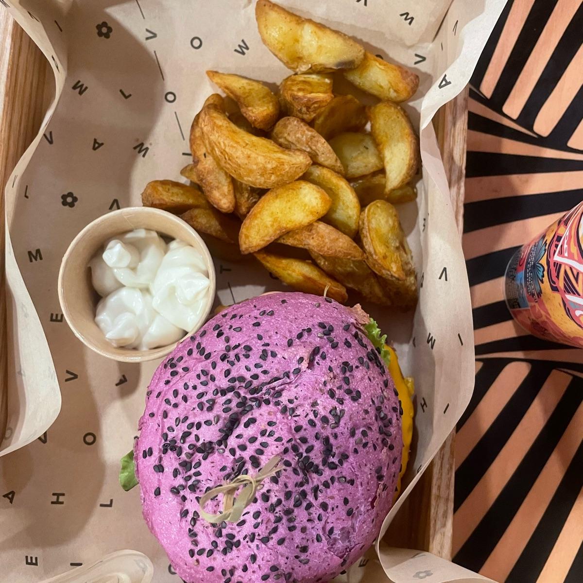 “Un fiore in bocca può servire sai, più allegro tutto sembra” cantavano Battisti e Mogol. Ed è proprio questa la mission di Flower Burger, la prima veganburgheria nata nel 2015 nel cuore di Milano, in continua espansione sia in Italia che all’estero. Il fiore come espressione di positività, gioia e amore. Un legame con la natura che si declina nelle tonalità dell’arcobaleno con una proposta culinaria 100% vegan: burger la cui caratteristica fondamentale è il colore. Si passa dal pane giallo fatto con la curcuma, al viola grazie alla carota nera fino all’amatissimo rosa, ottenuto grazie all’estratto di ciliegia. Il team di Flower Burger è sempre alla ricerca di nuove colorazioni naturali e di nuovi ingredienti per stupire e colpire i nostri clienti. Jungle Burger, Flower Burger e Cherry Bomb sono solo alcune delle proposte offerte accompagnate da patate profumate alla paprika, edamame o patatas buenas. Germogli di soia, tofu, ceci e quinoa sono ormai divenuti cibi del nostro quotidiano e Flower Burger sa come abbinarli per creare un burger dal sapore esplosivo che faccia innamorare tutti. Uno concept nato dall’idea di Matteo Toto, giovane imprenditore, che ha intrapreso un viaggio alla scoperta di gusti e sapori e alla ricerca del punto d’incontro perfetto tra l’hamburger e la cucina vegana. Una volta varcata la soglia del locale si è accolti da un’atmosfera friendly che ammicca alla cultura dei “figli dei fiori”. Il locale ospita pareti grafiche colorate e psichedeliche mescolate ad atmosfere del mondo del clubbing, dando vita a un divertente gioco di luci. Un sottomarino campeggia sulle pareti a ricordarci il Yellow Submarine dei Beatles e dietro ad una tenda colorata anni ‘70 si trova la cucina, il luogo dove nascono le nostre creazioni!