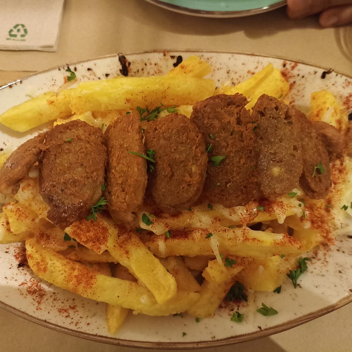 Salchipapa de beyond burguer y papas fritas. Simple, pero bueno. Y tiene queso
