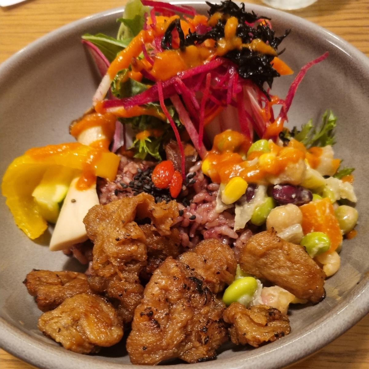 Meal was quite colorful and the soy meat was very nicely seasoned. Loved the beet salad especially!