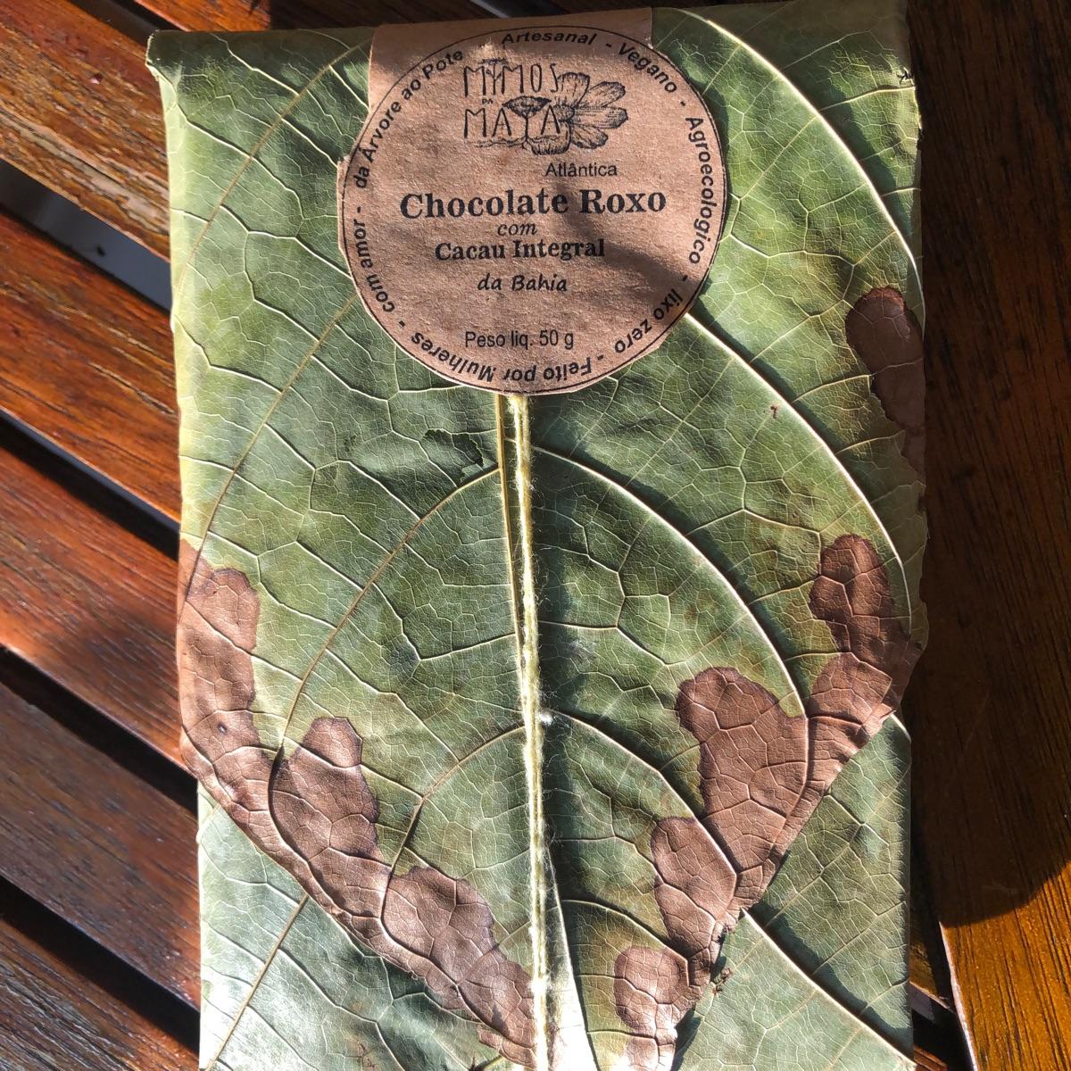 Uma barra de chocolate única de cor roxa feita com mistura de cacau e castanha de caju! Nunca comi nada parecido!