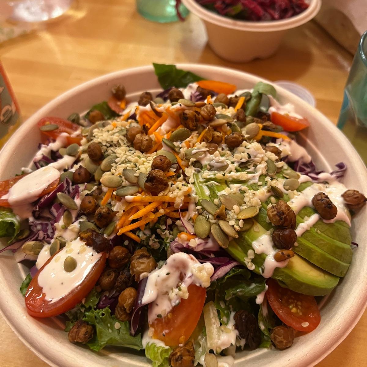 Super yummy salad bowl! I love the mix of crispy chickpeas with the soft avocado and creamy dressing. I highly recommend getting one of their “chicken” sandwiches here. So satisfying and delicious!