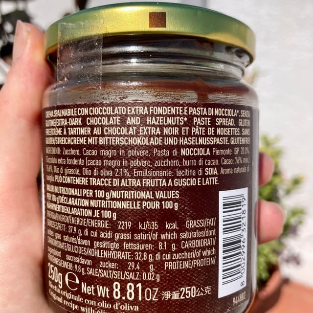 The main ingredient is #sugar, but to me it tastes more on the bitter side. It’s also made with #hazelnut , #cacao , #oliveoil , #sunfloweroil .