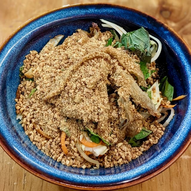 Chilled sweet, savoury, and spicy salad with crunchy shredded vegetables such as unripe papaya, mixed herbs, plus a shower of chopped roasted peanuts in a citrus lime and cut chilli dressing. I personally wasn't a fan of the deep fried seitan chicken as it was very tough to chew on; would have preferred more tender soy skin sticks. Small portion even for a light meal; might have to be paired with another side! (Allium-free option available, $11.80) #sgvegan #vietnamese #womenowned #minorityowned
