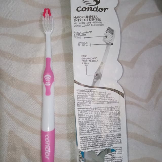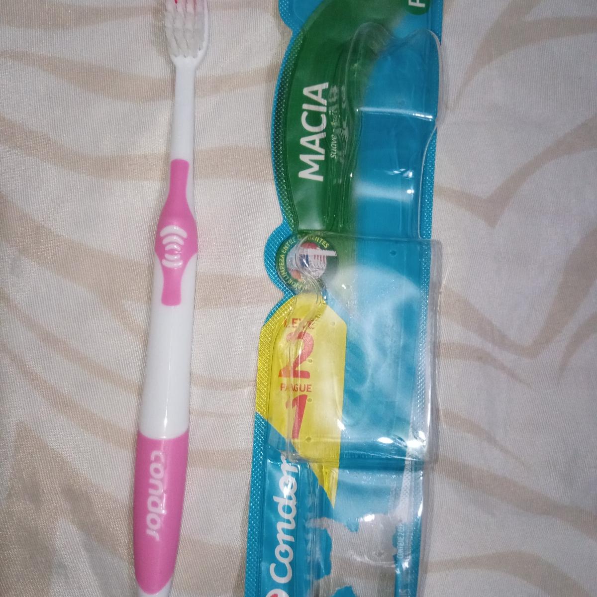 Escova dental em embalagem com duas unidades, mais econômica, tem cerdas macias e cabo emborrachado.