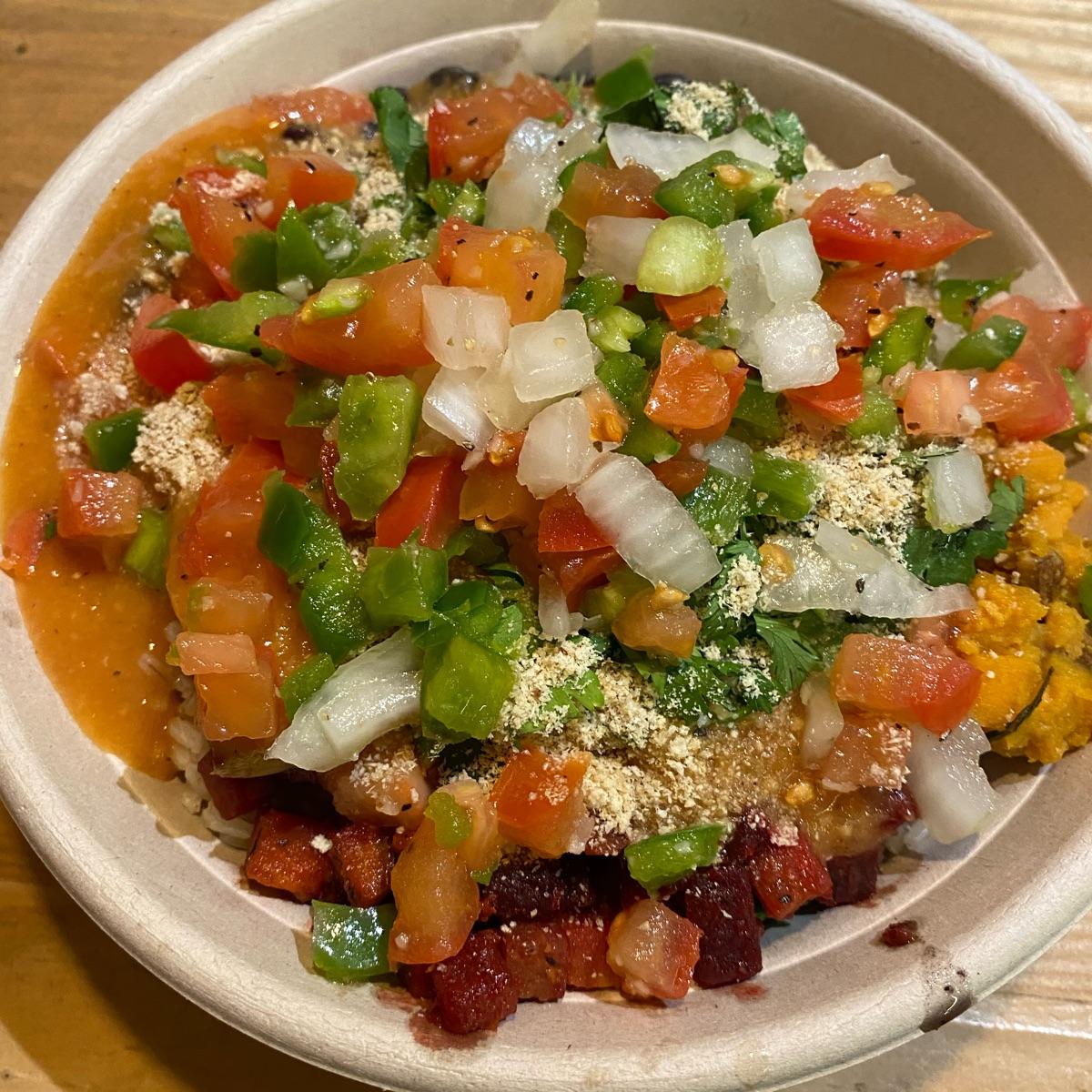 This place blew me away a little bit! Omg, my bowl was delicious and contained only whole plant foods, well, and some incredible roasted tofu! Brown rice, collard greens, Brazilian black beans; everything was delicious and their sauces were outstanding too. The small bowl, which would be great for anyone for a as meal was $9.75 and the large, which was a lot of food, was $14.75 or so. Wish I had one of these in my hometown!