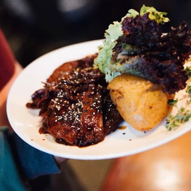 Muy bueno, el seitán con buena textura y la salsa muy rica. Venía con dos papas enteras. Me pareció caro. Me olvidé de sacarle foto así que subo una propia del restaurante.