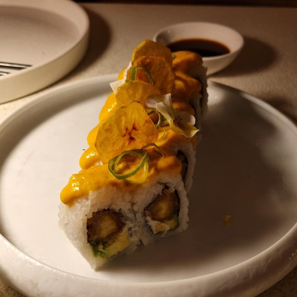 Amazing rolls with cashew cheese, crunchy plantain chips and avocado. It was spicy for me, which was better, but it was just not announced on the dish.