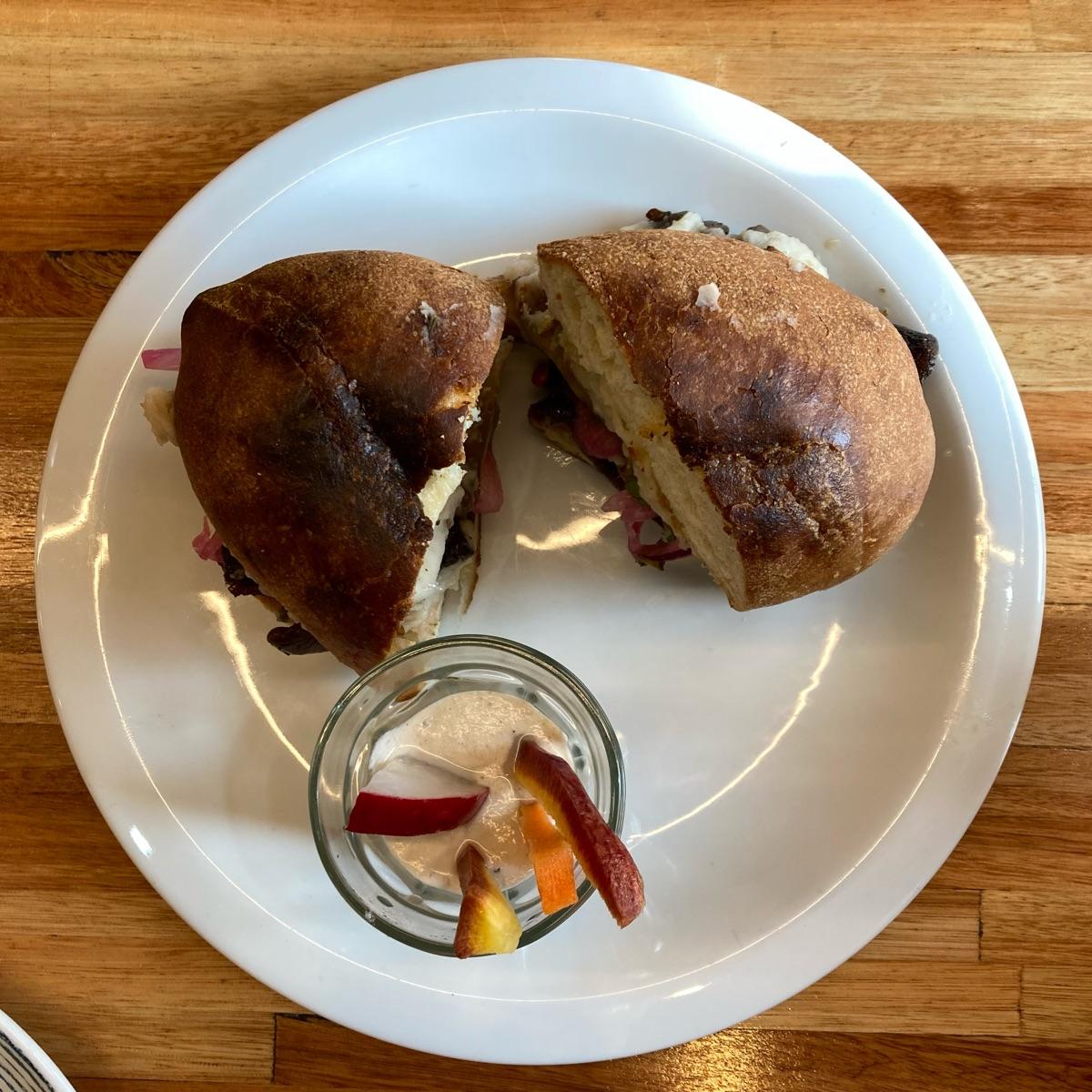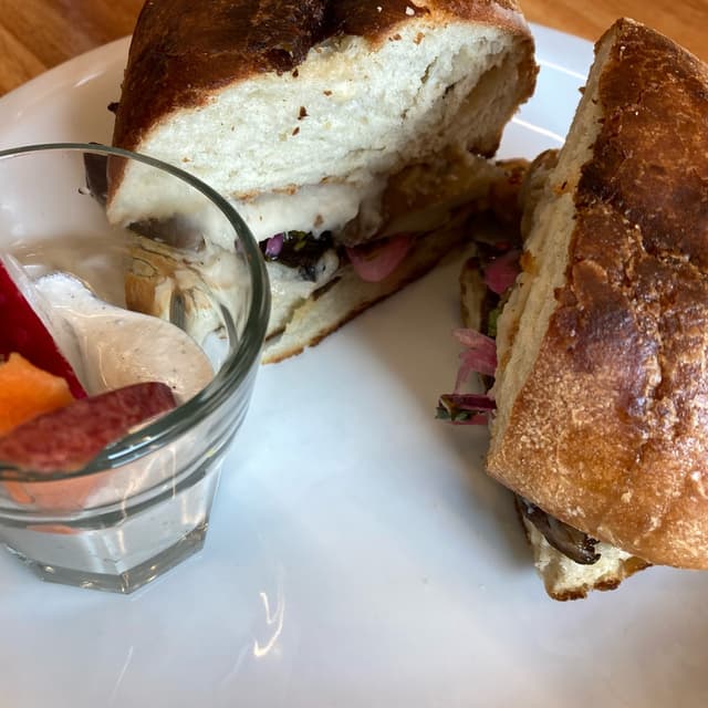 Este Sandwich de Gírgolas viene en Pan de mandioca con puré de alubias y cebollas con limón. Y te dan un dip de castañas con bastoncitos de zanahorias de diferentes colores.