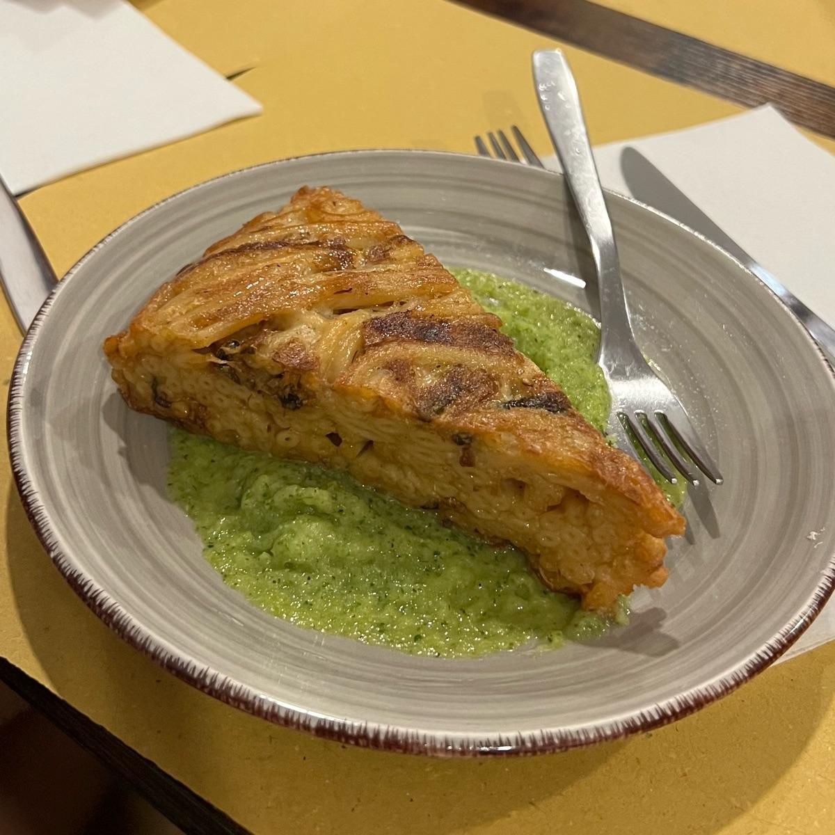 Frittata di pasta, croccante fuori e morbida dentro. Accompagnata da crema zucchine e impregnata di succo di limone. Buona 6€#santuariocapraliberatutti