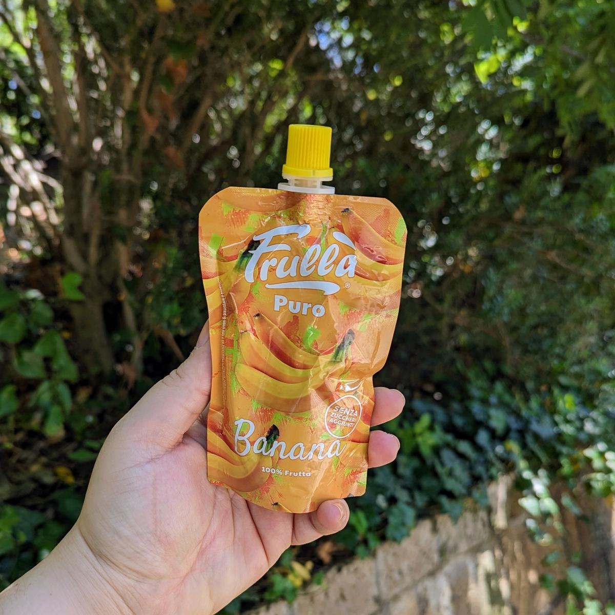 Frutta frullata al 100%, pronta da portare in giro per merenda. È banana al 99%, con un pochino di succo di limone usato come antiossidante.