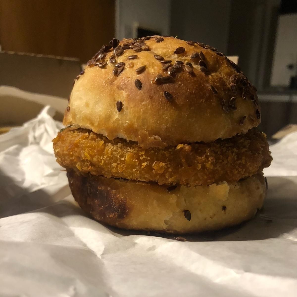 Riquísimo el tofu orgánico crispy con queso cremoso gratinado, mix de verdes y Veganesa de chimi. Excelente y con las cantinas justa de papas