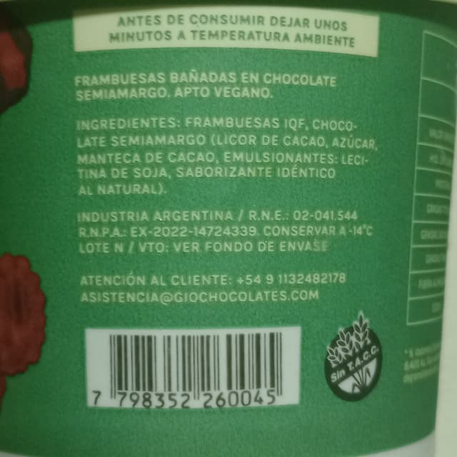 Frambuesas bañadas en chocolate semi amargo apto celíaco. El pote trae una buena cantidad de frambuesas. Me parecieron muy ricas e ideales para estos días de estudio💚. Las compré en Fan de Pan. Ojo que el pote de frutillas no es vegano.