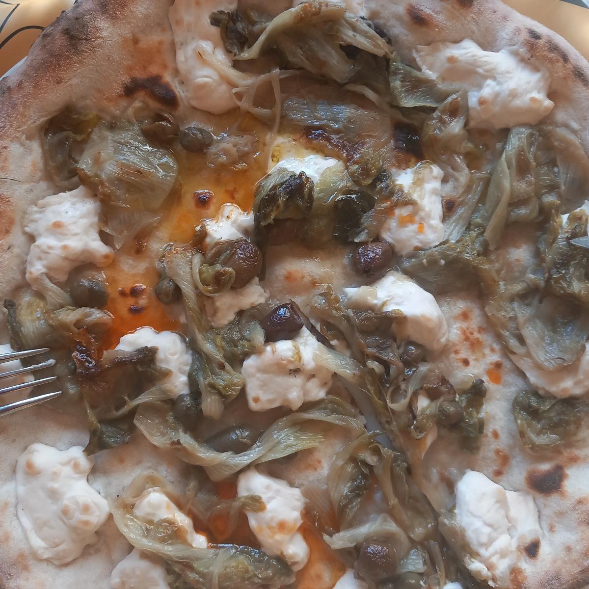 Dio grazie... una pizza con scarola, capperi, olive taggiasche e mozzarella veg degna di nota! Impasto leggero che sazia ma non abbastanza. La mozzarella vegana è stata cambiata (prima ne usavano un'altra) ed è decisamente soddisfacente 😊. Goduria massima se si aggiunge un filo di olio piccante e olio all'aglio. Da provare assolutamente. Prezzo € 13.