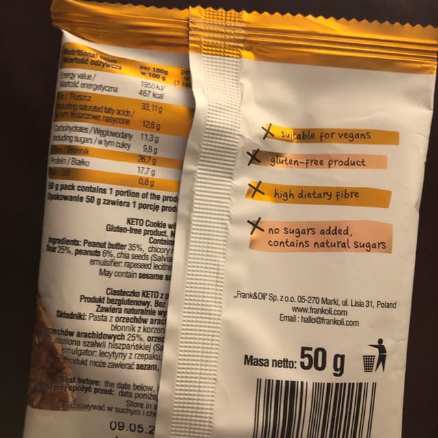 Keto peanut butter soft cookie! Bought in SuperValu. Taste is alright however the texture is more akin to a raw nut paste so I don’t think it would satisfy a cookie craving. Contains 8g protein per cookie.