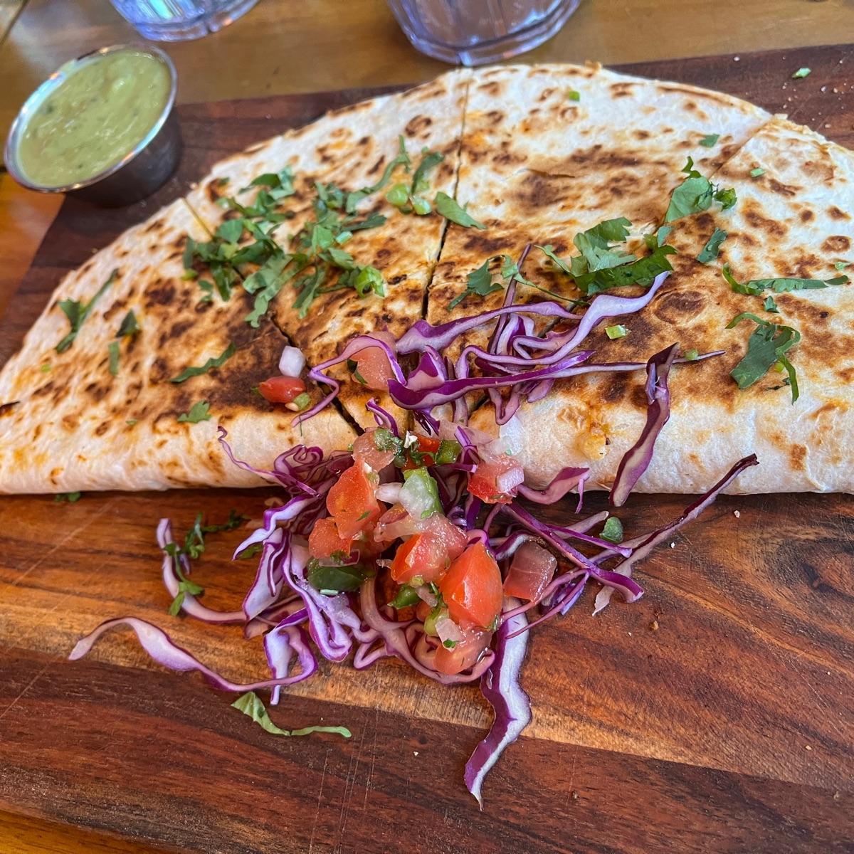 Love this place!! Sooooo cute and colourful here and amazing flavors. 🇲🇽🌯🌮 My partner was gushing about this and it was indeed awesome. 12-inch flour tortilla, asada, soy chorizo with potatoes, caramelised onion 🧅, cheddar cheese, cotija style cheese, with a side of pico de gallo and avocado 🥑 salsa. It’s very difficult to choose as everything sounds delicious. #veganmexicanfood #veganquesadilla
