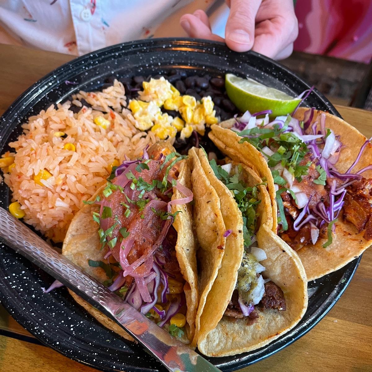 Choice of three tacos with a side of black beans and rice. 🌮🌮🌮🫘🍚 $19.00 Omnivores were not too excited about it but it looked good to me. The cauliflower taco sounds great. 🇲🇽