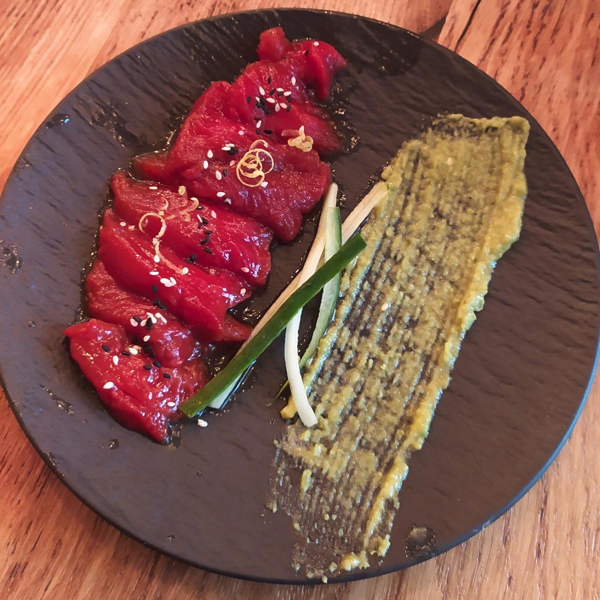 Einfach wow! Ich habe nie Sashimi probiert und war neugierig, wie eine vegane Version sein könnte. Und eigentlich war es sehr fruchtig, ich vermute, auf Wassermelonenbasis oder so ähnlich, aber es hat mir wirklich gut geschmeckt, da es super erfrischend und originell war. Mein Freund war von der Konsistenz beeindruckt, er sagte, dass es wirklich an Sashimi erinnerte. Es war ein Tagesgericht, aber hoffentlich kommt es noch häufiger in die Speisekarte!