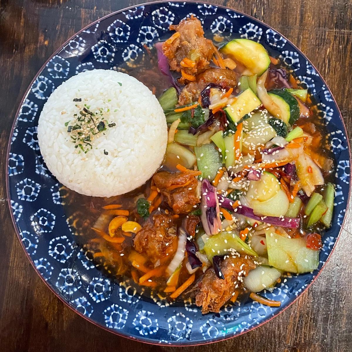 Described as deep fried suji, seasonal vegetables and cashew nuts in sweet chilli sauce. Pretty sure the suji is Lamyong Salted Crispy Chicken which is fkn DELICIOUS, although I prefer it when served straight from the fryer. As here when it was coated in sauce it lost some of its addictive crunchiness and became a little chewy. Very generous serving as always for Vegeme, but I managed to get through the whole plate. All in all a solid dish, but not my favourite from here and not sure I’d order this one again.