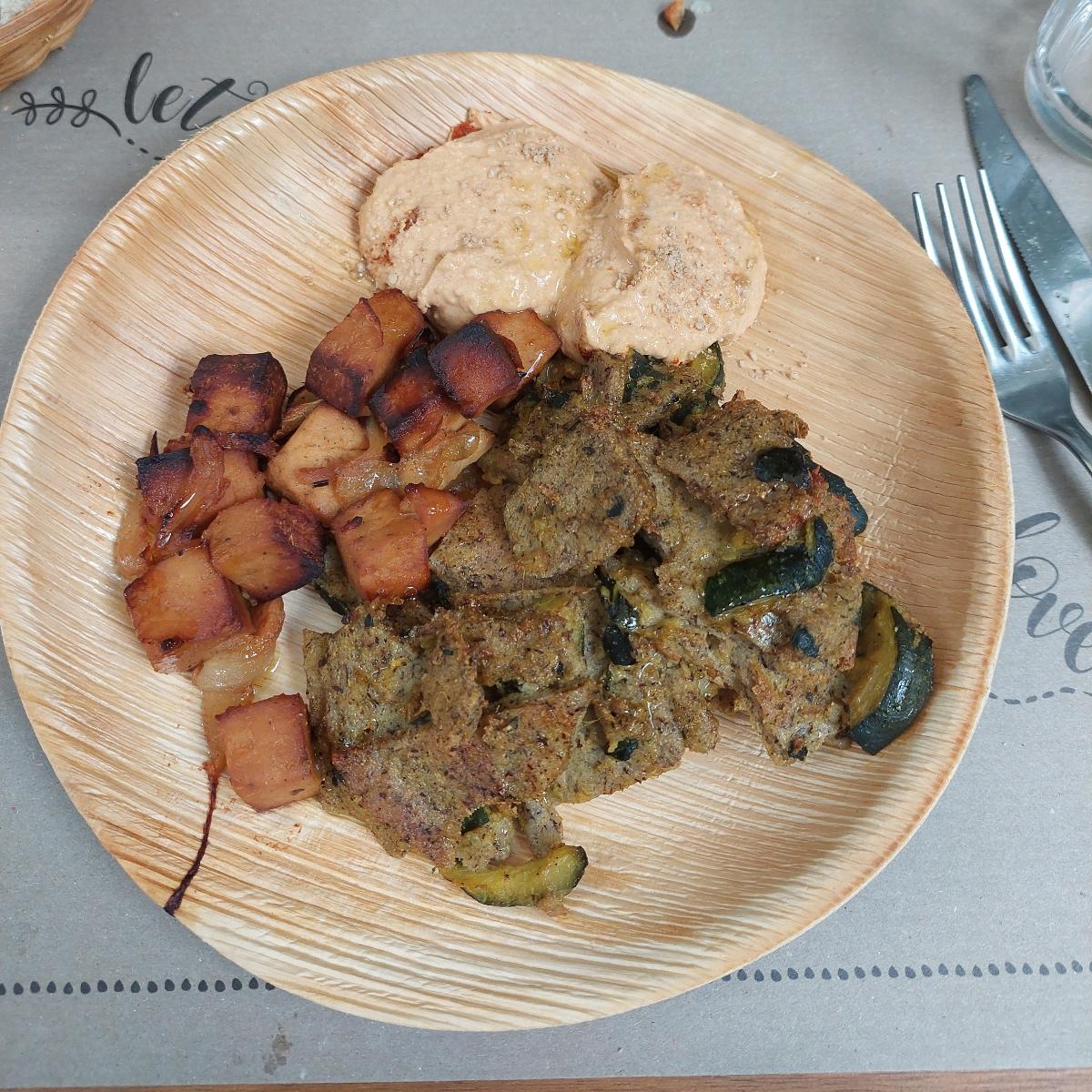 Piatto unico composto da:- Testaroli con curry e Zucchine- Tempeh alla veneziana - Hummus di ceci senza Aglio.Encomio speciale al tempeh: sensazionale!!