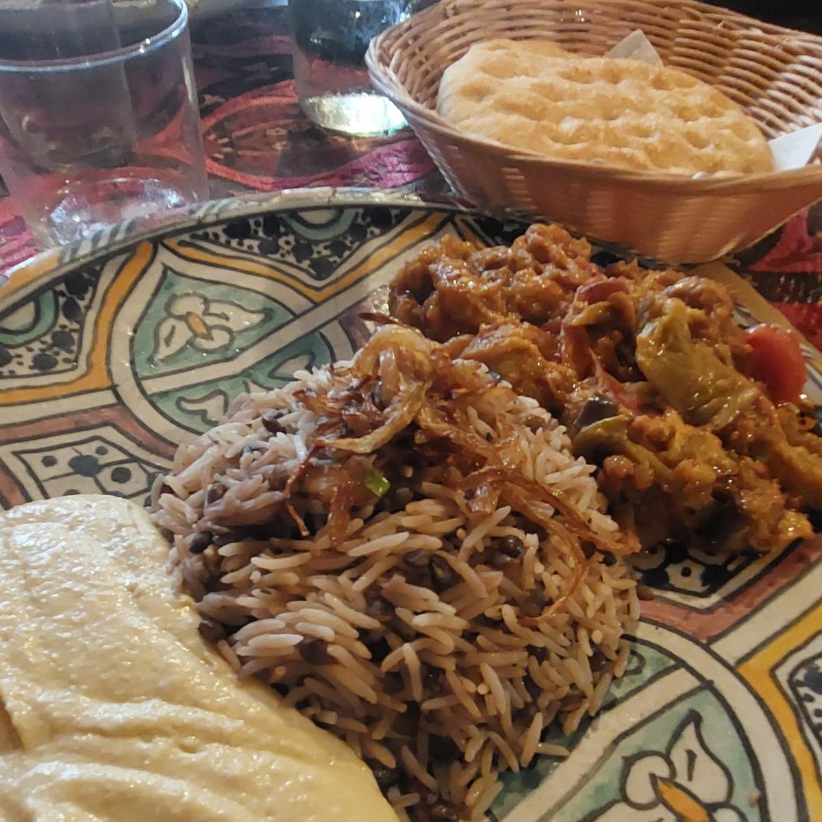 tante opzioni veg, piatto molto gustoso. le melanzane al sugo erano davvero eccezionali. ho preso anche riso e lenticchie, hummus e focaccia. posto carino e originale, ottimo per un pasto etnico.