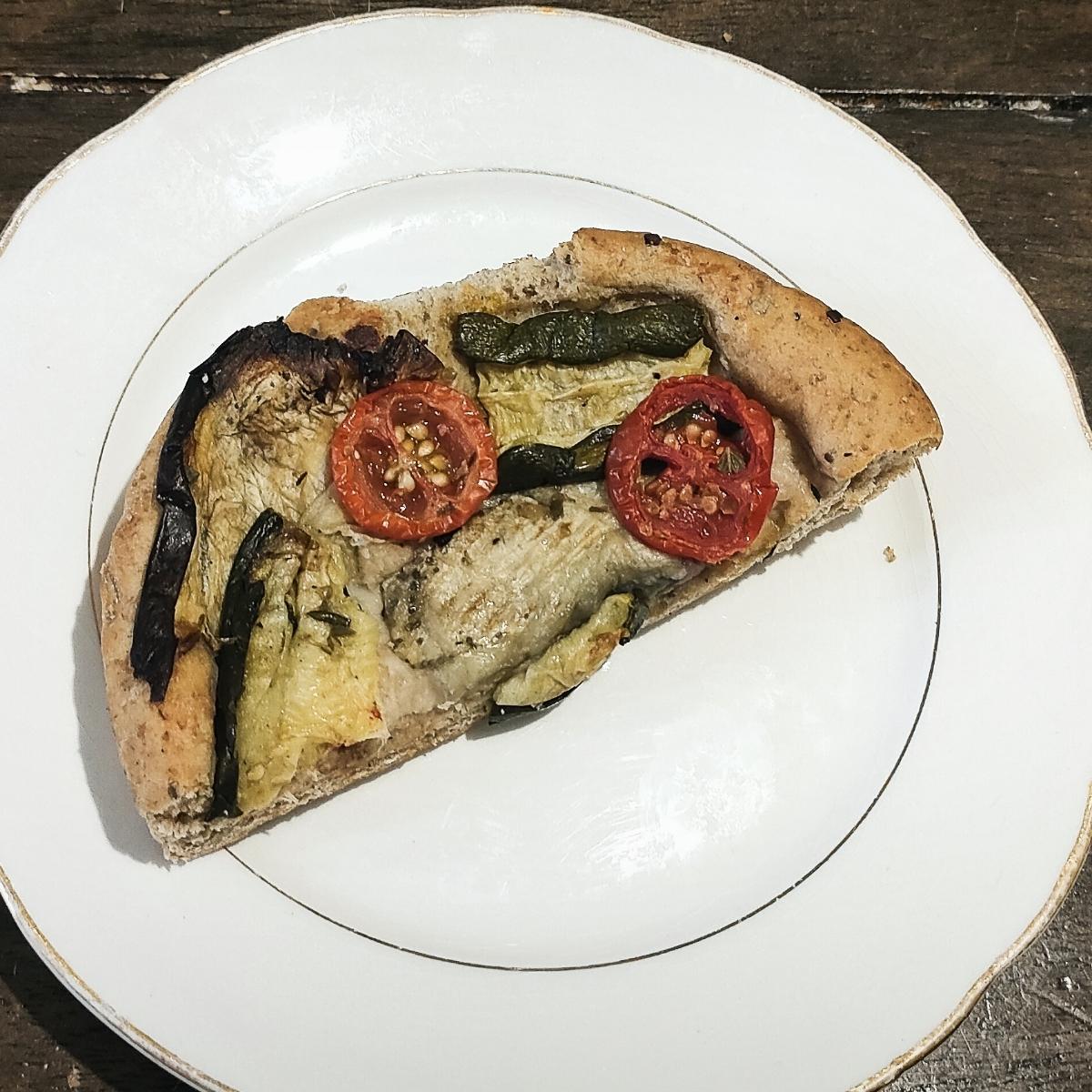 Pizzetta vegana con zucchine, melanzane e pomodori,ma c'è anche in versione solo pomodorini. Molto morbida e saporita.