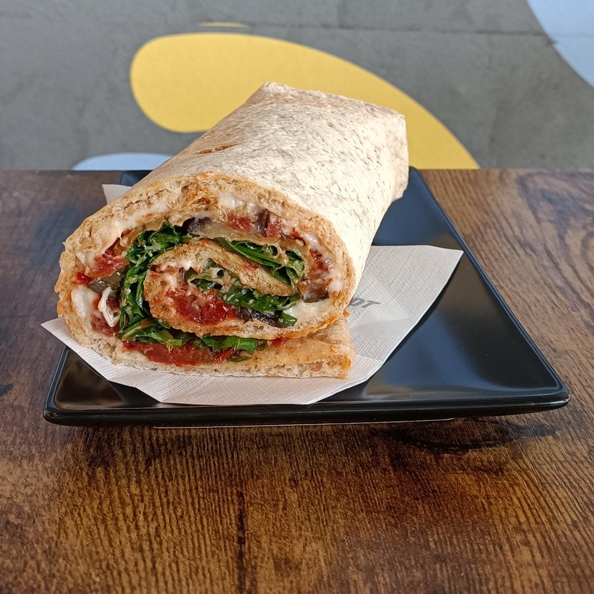 Piadina arrotolata con impasto integrale, stracchino vegetale fatto in casa, pomodori secchi, melanzane arrostite e rucola fresca, squisita!