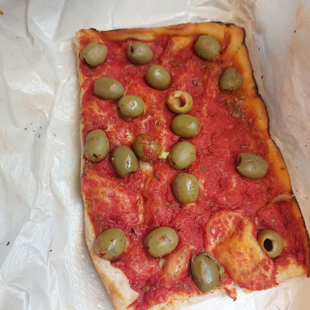 A proposito della #pizza, invece, posso dire che, dopo aver assaggiato la #farinata di #ceci che era una vera delizia, e convinta dal suo aspetto invitante, mi sarei aspettata molto di più. Forse per causa dell'asporto (ma l'avrò mangiata sì e no due ore dopo averla comprata), mancava totalmente di croccantezza. Era molto molto morbida, quasi pastosa. Il pomodoro non aveva un sapore molto deciso. Ma le olive, invece, davano quel tocco in più che mancava nel resto. Ovvio, devono piacere, e io amo quasi tutti i tipi di oliva e in quasi tutte le preparazioni, quindi non sono un buon metro di misura 😅 in ogni caso, pizza #accidentallyvegan