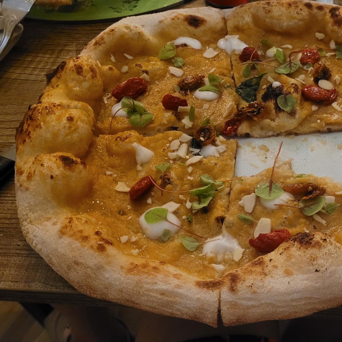 Ottimo impasto. Pizza con crema di pomodorini, pomodori secchi, maionese di mandorle e scagli di mandorle. Molto buona. Il ristorante è elegantissimo ma anche costoso #pizza #firenze