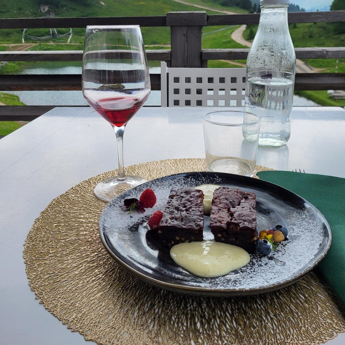 Brownie cioccolatoso da urlo, accompagnato da crema alla vaniglia golosa, con vista ⛰️✨️