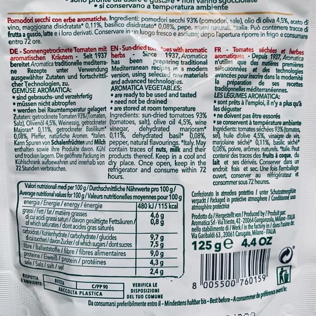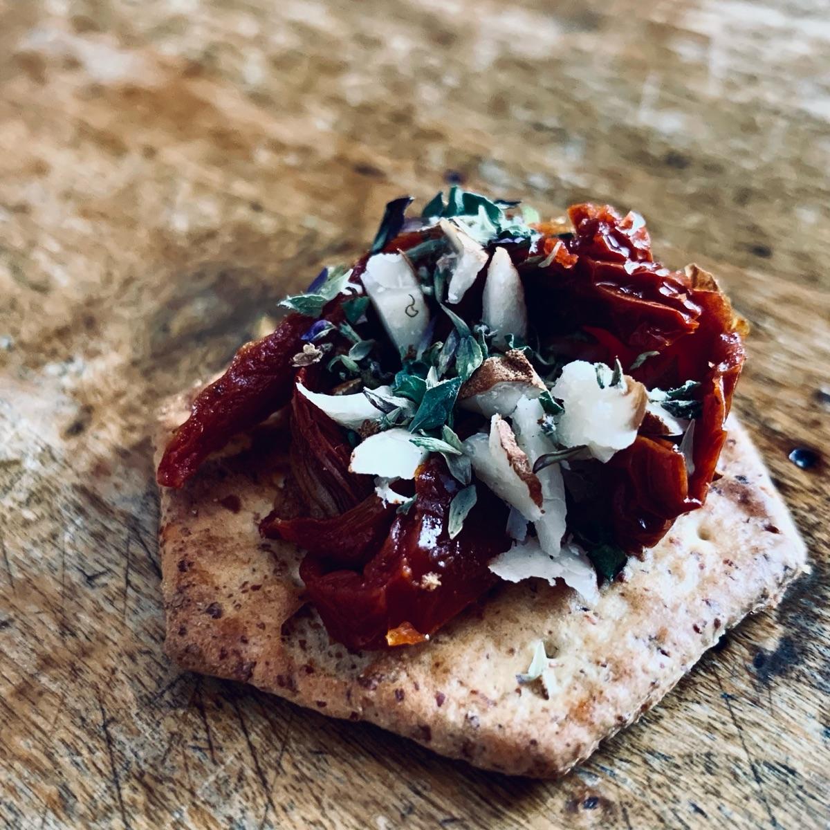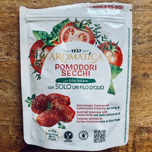 Pomodori secchi conditi con un pochino d’olio ed erbe aromatiche. Sono molto morbidi e saporiti - come i pomodori secchi e asciutti ma con un sapore di spezie in più. Ottimi per aperitivi veloci (così come sono o su tartine) perché non necessitano di alcuna preparazione (es: ammollo). Personalmente però preferisco quelli essiccati e senza condimenti aggiunti (a parte il sale) perché sono più versatili e posso condirli di volta in volta come preferisco.