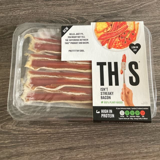 Introducing This isn't Bacon Plant-Based Rashers - the ultimate meat-free alternative that will leave you craving more! Made from 100% plant-based ingredients, these rashers are perfect for satisfying your bacon cravings without harming a single animal. With a smoky flavor and crispy texture, they're sure to impress even the most discerning meat lover. Whether you're looking to switch to a plant-based diet or simply want to reduce your meat consumption, This isn't Bacon Plant-Based Rashers are the perfect solution. They're great for adding flavor to your favorite dishes, from sandwiches and burgers to pasta and salads. And with rave reviews from both vegans and non-vegans alike, you can rest assured that these rashers are a hit with everyone. So why wait? Try This isn't Bacon Plant-Based Rashers today and experience the delicious, guilt-free taste of bacon that's kind to animals and the planet.