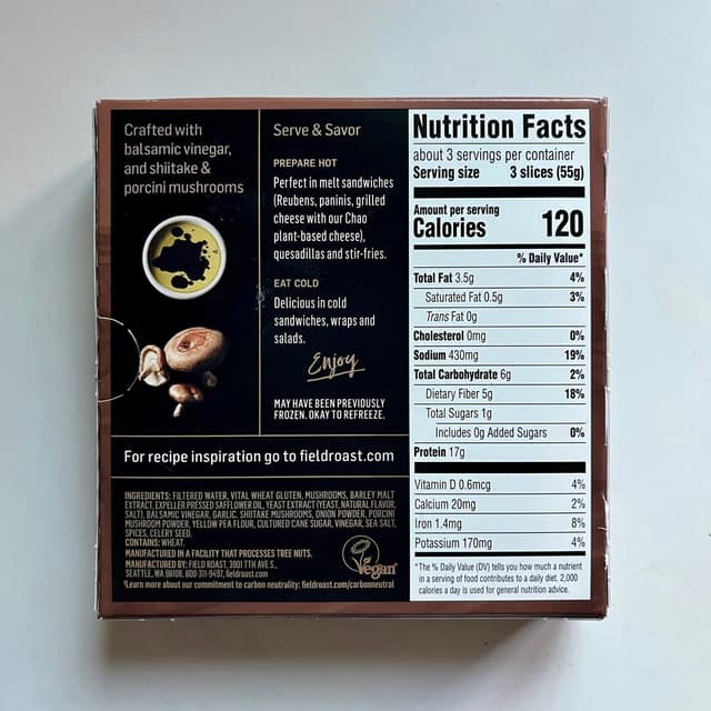 Though they’re a bit high in sodium, the protein content is also mind-boggling! Can you believe there’s 17g in just three thin little leaflets? The next time someone asks #wheredoyougetyourprotein, you can point them toward Field Roast and let them know that it’s really quite easy when you #hailseitan. Though I’m not sure whether the advertised balsamic really came through for me, I quite enjoyed the taste of these slices. It doesn’t hurt that they were a total #groceryoutletfinds steal — just $1.29 since they (allegedly) expire today! Though it’s hard to beat that price, I’d probably buy them again if I wanted to assemble a fancy vegan charcuterie board or something of that nature.
