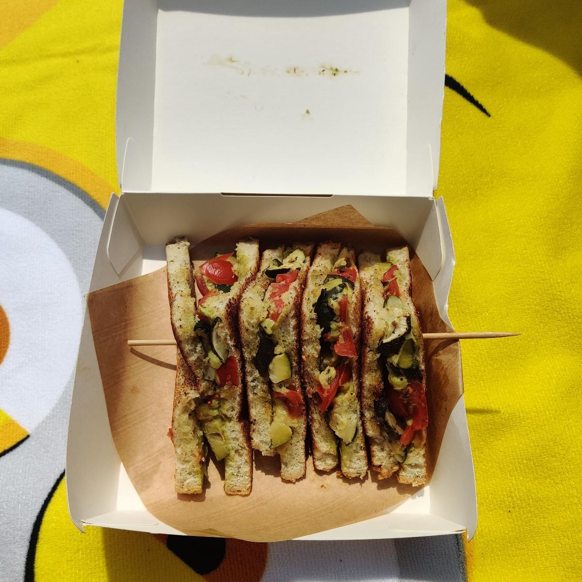 A sandwich with avocado cream, zucchinis, cherry tomatoes and mint emulsion. I chose it because of the cherry tomatoes and have to say it was quite good, but maybe because it was already quite late and I was by the lake and everything tastes better in fresh air. It was quite light and fresh (thanks to the tomatoes), but maybe could have used some more salt. I wish they had more (filling) options for vegans. I took the bread of the day which was something with sesame seeds and arugula, that had thankfully more salt in it.