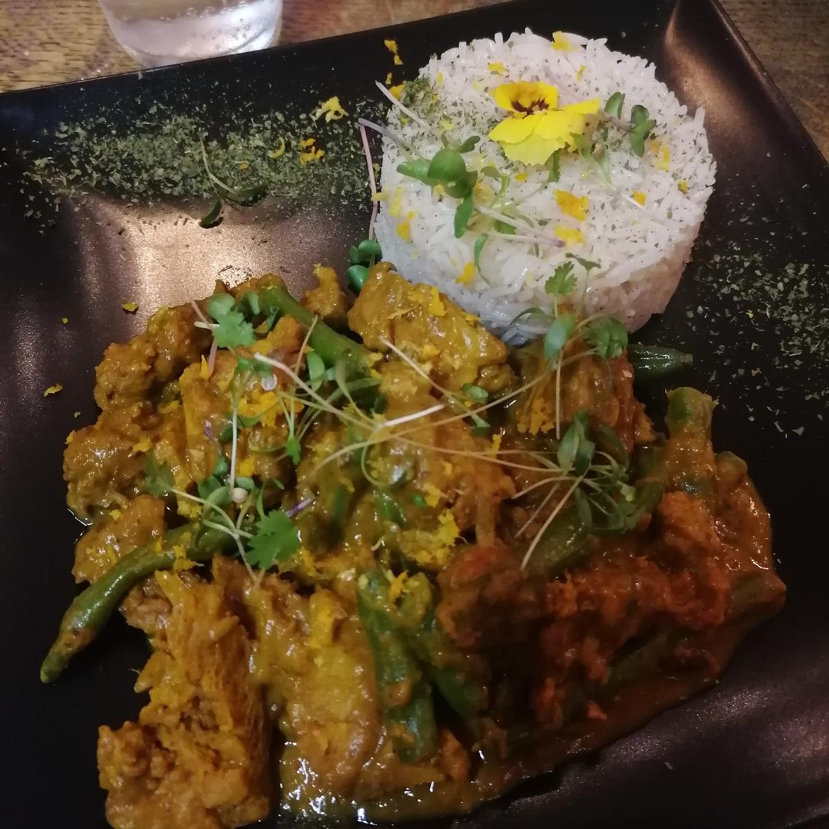 Bocconcini di soia al curry, con fagiolini e riso basmati. Piatto molto abbondante, bilanciato, speziato il giusto. Molto buono
