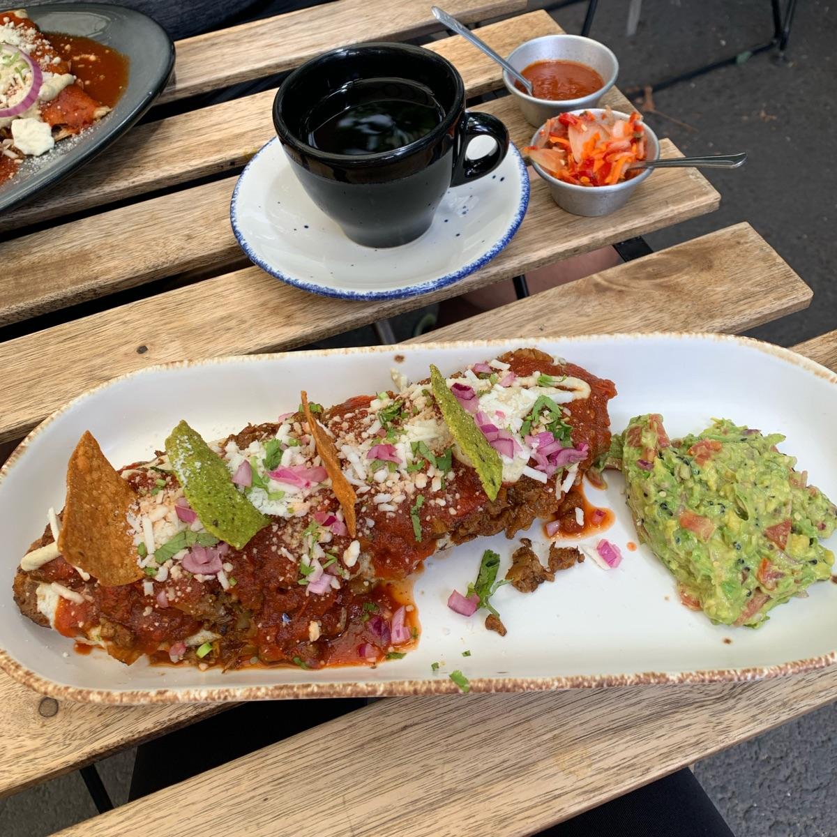 Este desayuno consiste en una mitad de pan rústico con frijolitos y queso gratinado (tipo mollete) y se supone que llevaba chilaquiles rojos pero en realidad lo que viene en salsa roja es el chorizo que elegí, puedes agregar cualquiera de los guisos de su menú y de chilaquiles sólo son los 4 totopos de colores que vemos en la foto 😅 aún así estaba muy rico, de guarnición guacamole y más bien usé los totopos para comerme el guacamole 🥑 Muy rico y llenador.