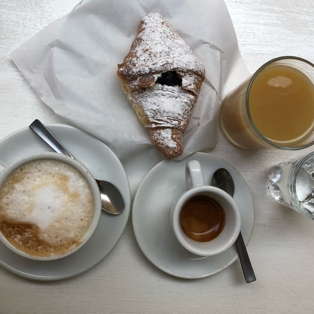 Tipica colazione italiana, ma vegana! Cornetto sfogliato al cioccolato, cappuccino di soia, acqua, caffè e succo alla pera! Tutto molto gustoso e a prova di onnivor3.