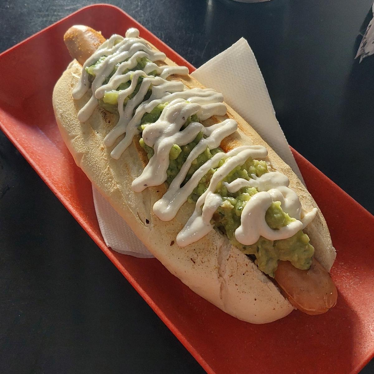 Este cachorro-quente é bem diferente, tem uma salsicha grelhada, molho de tomate, guacamole, e cream cheese por cima. Achei uma delícia! Muito original e a combinação de sabores e texturas ficou perfeita. O pão é bem macio mas manteve tudo no lugar sem desmoronar, o que foi ótimo. Preço bem justo. Super recomendo! #hotdog #veganhotdog #cachorroquente #hotdogvegano #veganhotdogs