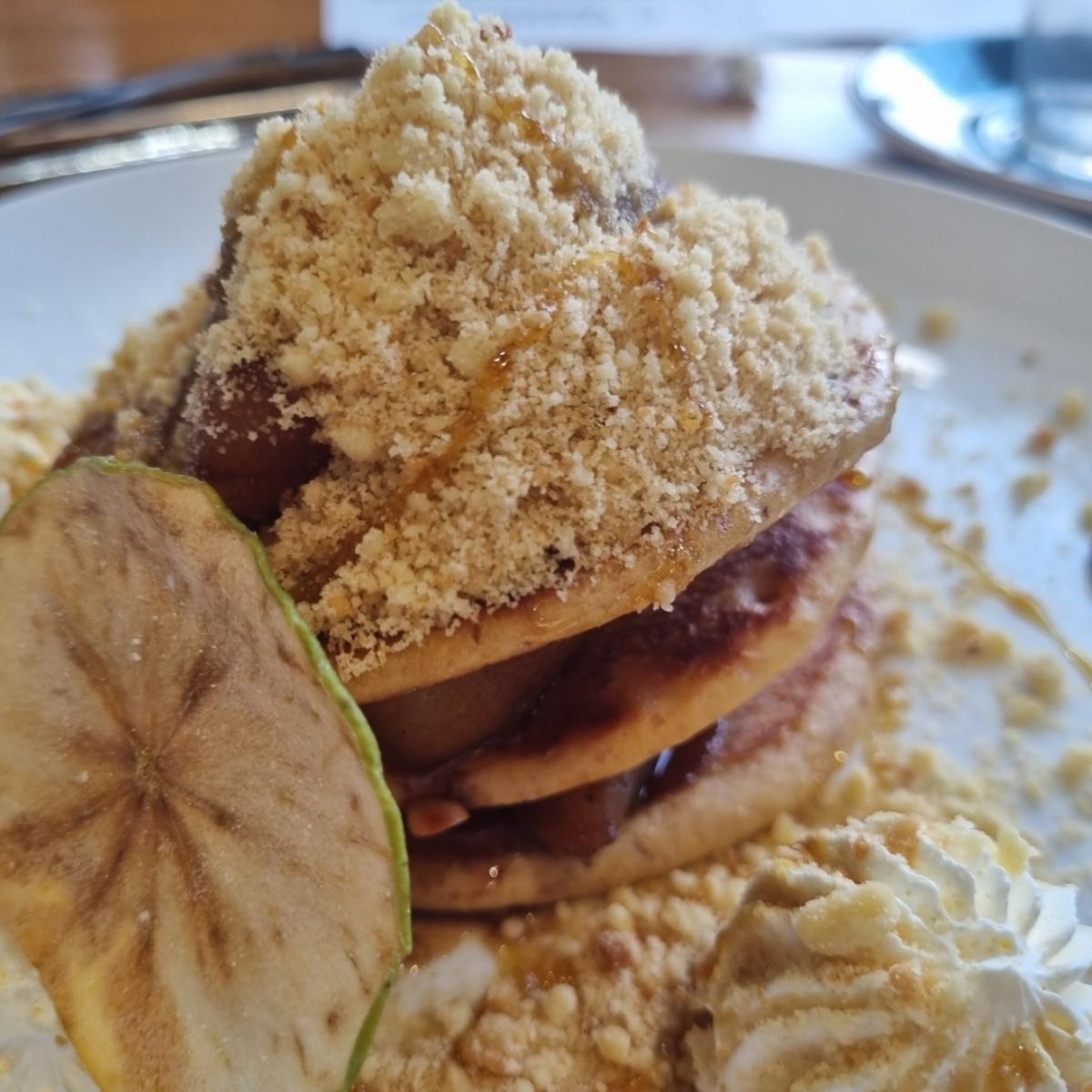 Very yummy dish! Everything is so delicately plated it really looks so beautiful! This dish has a stack of fluffy pancakes, crumble, apple with sauce and coconut cream dollops! 🥞