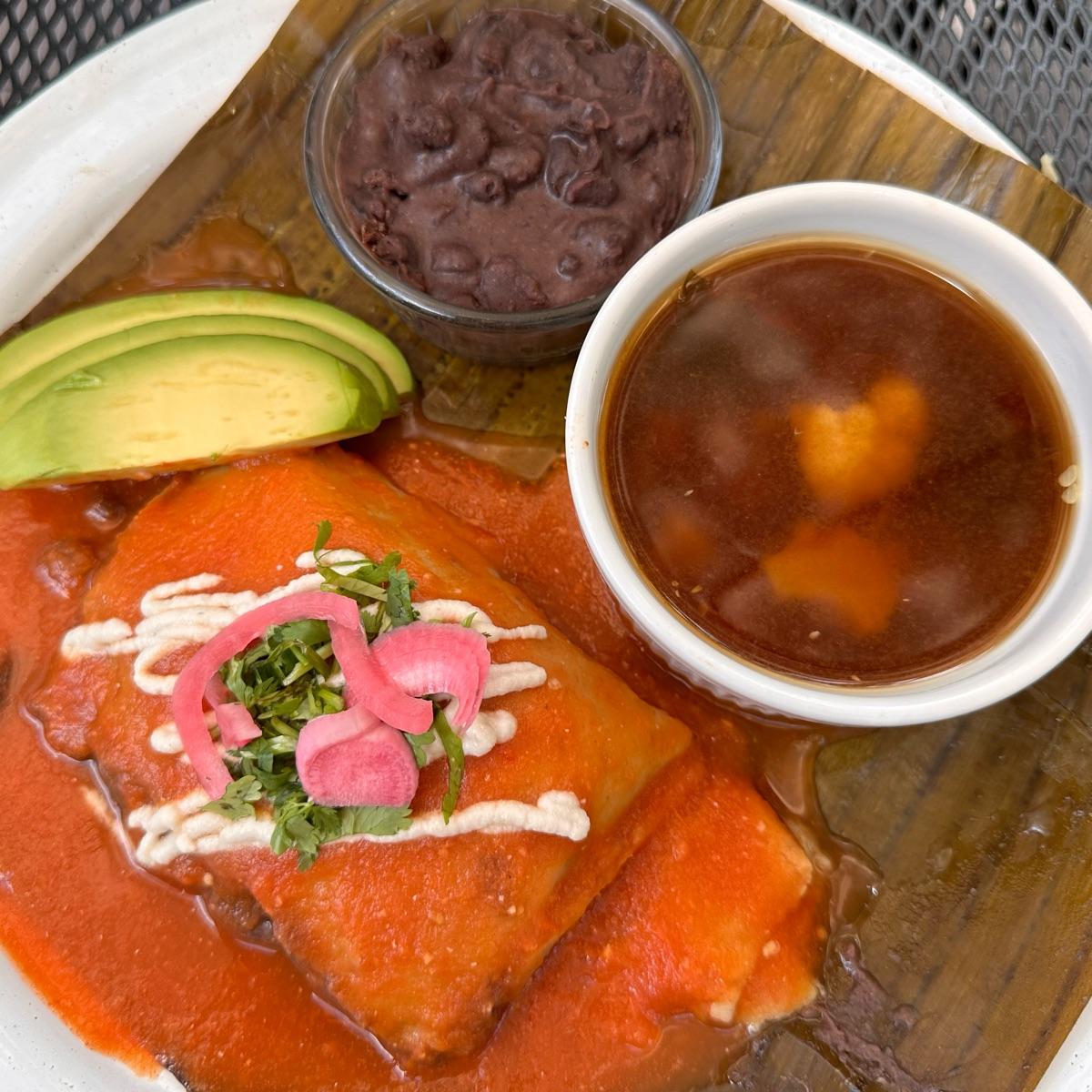 Tamal de frijol en salsa roja, la salsa es lo mejor del plato, está súper rica. Tiene de guarnición más frijoles entonces creo que fue mucho pedir también el tamal de frijol, pero está muy rico