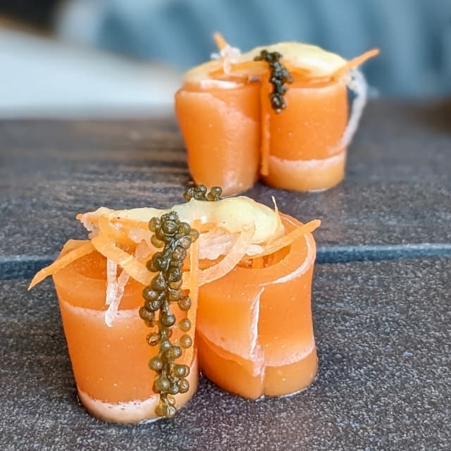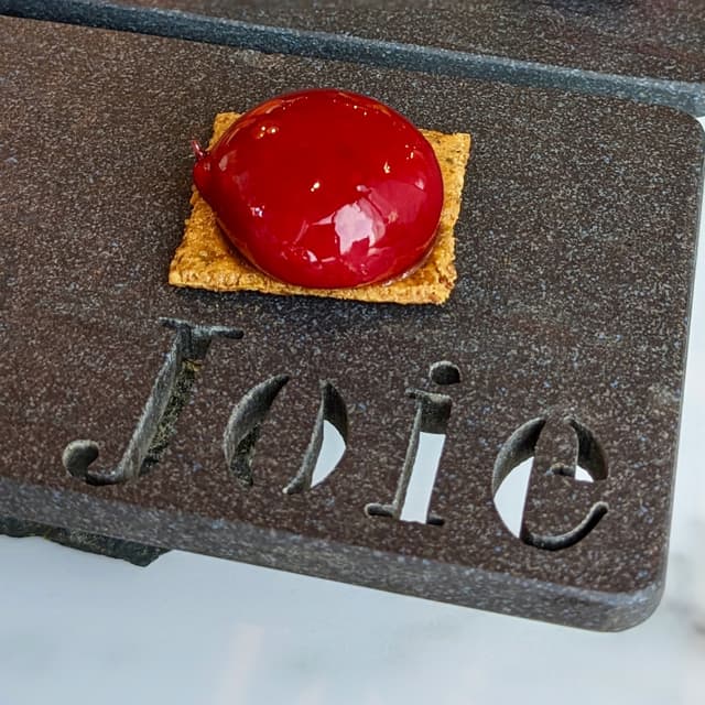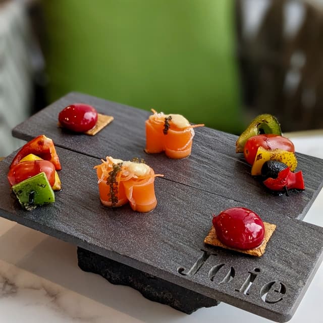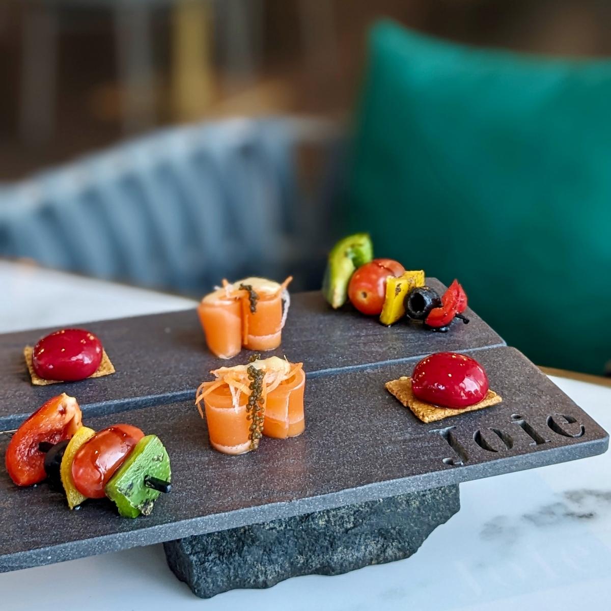 Assorted platter consisting of konjac salmon sashimi topped with sea grapes (more soft and enjoyable than the usual rubbery konjac salmon); vegetable skewer including tricolour bell pepper, cherry tomato, and black olive; as well as a tangy raspberry juice-filled burst served on a biscuit. (Staff said Chef's Selection Starter may contain alliums) #sgvegan #wholefoodplantbased #wfpb