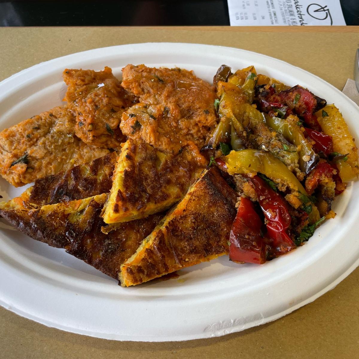 Ristorante/rosticceria self service dove hai la possibilità di creare il tuo piatto con 2 o 3 pietanze a scelta..! Qui ho scelto bistecca di soia, farinata di ceci e peperoni grigliati