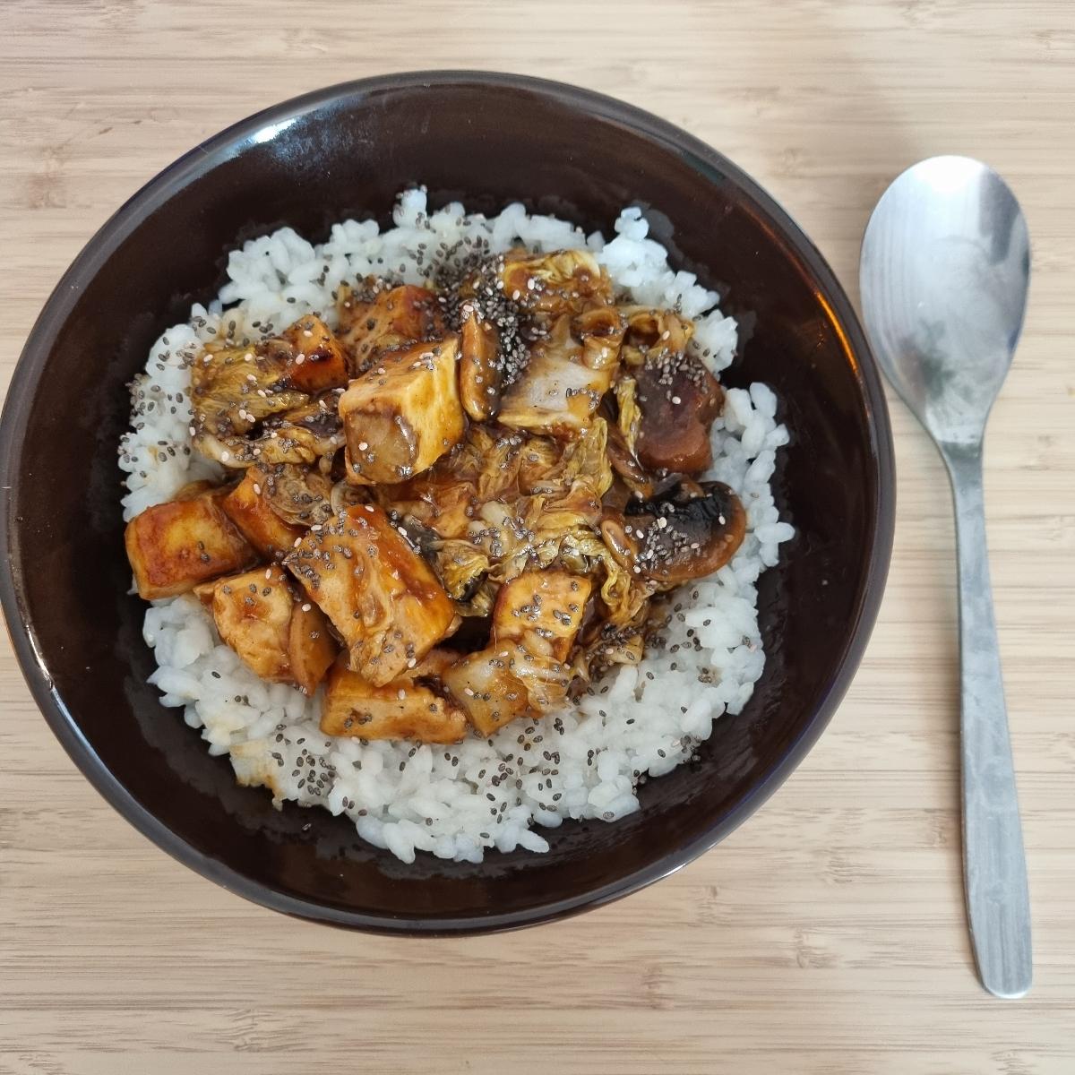 Receta con tofu estilo japonés bio de bok choy con champiñones, salsa de soja, Chía y arroz estilo japonés. Recomendado🤤 como la mayoría de los tofus, no tiene mucho sabor, pero con algunas salsas y especias, coge mucho el sabor. #tofu #bokchoy