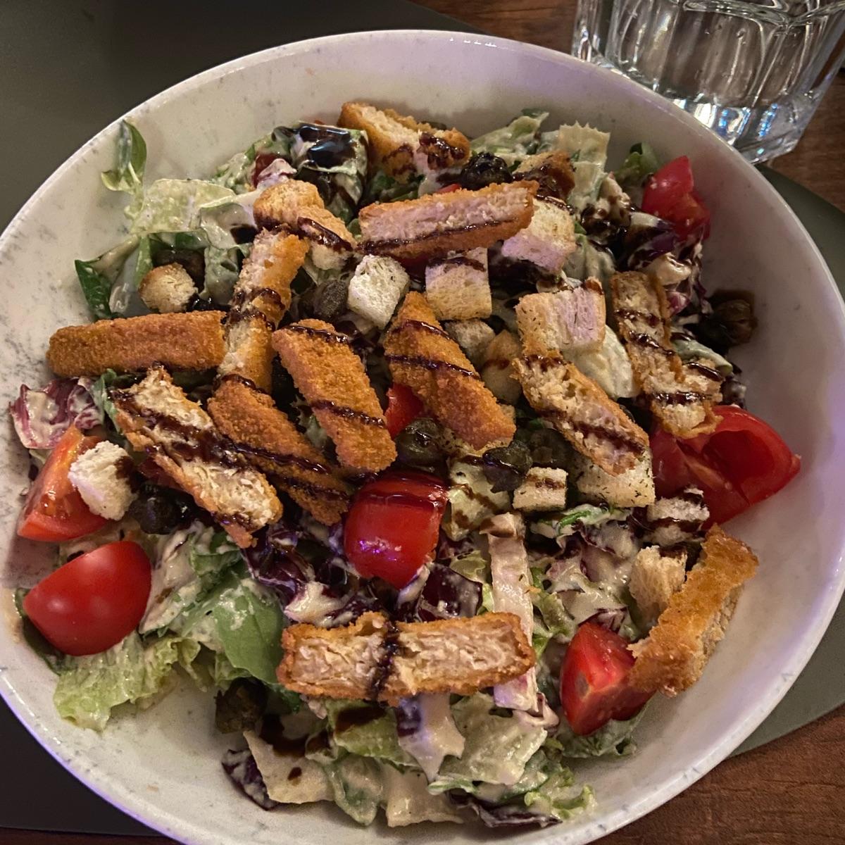 Ottimo piatto principale con mix di insalata, crauti, vegan nuggets, crostini di pane e cesar dressing, una cremina deliziosa a condire il piatto €14 #cesarsalad #nuggets
